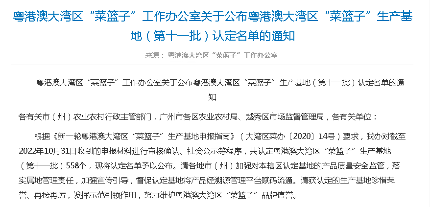 喜讯!粤港澳大湾区“菜篮子”生产基地(第十一批)认定名单公布,沃华科技农业生产基地榜上有名!